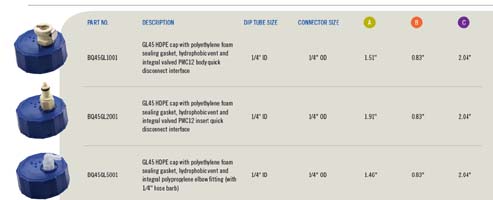 該BQ45GL系列瓶蓋的設(shè)計(jì),以適應(yīng)任何瓶用45毫米頸部開口與GL線程。這些類型的瓶,通常被稱為試劑或媒體瓶,用于與分析儀器,醫(yī)療或體外診斷(IVD)的設(shè)備。